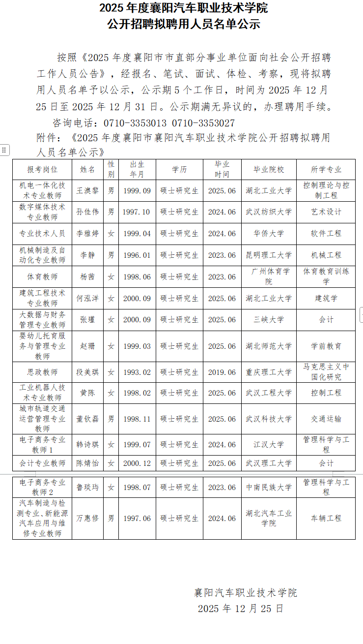 2025年度襄阳汽车职业技术学院公开招聘拟聘用人员名单公示